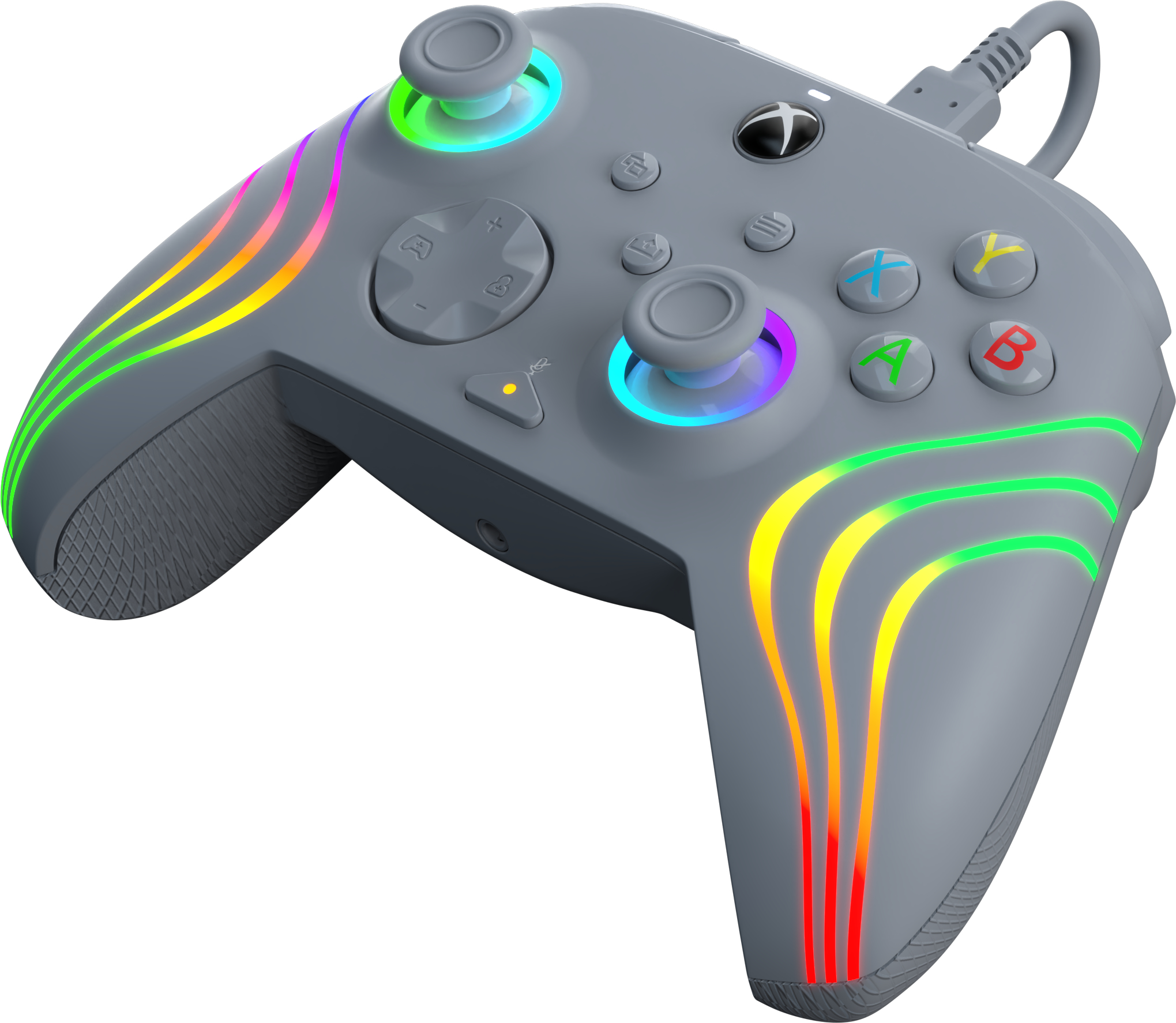 Sieh dein Spiel in einem völlig neuen Licht mit dem Grey Afterglow Wave Controller für die Xbox! Individualisiere dein Gameplay, erschaffe farbenfrohe Displays und mehr mit diesem offiziell lizenzierten Controller. Erzeuge Wellen mit den Millionen von Farben und Kombinationen der RGB-Beleuchtung und Einstellungen des Afterglow Wave Kabelgebundenen Controllers. Durchsuche die verschiedenen Lichteffekte und Farben mit der „Funktionstaste“ oder lade die kostenlose PDP Control Hub-App herunter, um die acht RGB-Beleuchtungszonen zu ändern und mehr. Passe deinen Controller mithilfe der App und unzähligen Optionen wie die Konfiguration der Tastenbelegung, der Trigger-Tasten und der Anpassung von Totzonen noch weiter an. Schalte den Gegner schnell und effizient aus, indem du die Controllerfunktionen auf die beiden programmierbaren Rücktasten konfigurierst. Nutze den integrierten Lautstärkenregler auf dem Steuerkreuz und schalte das Mikrofon schnell stumm, um Schnellfeuer-Anpassungen vorzunehmen, ohne deine Immersion zu ruinieren. Verbessere deine Genauigkeit und den alltäglichen Komfort mit den texturierten Griffen und Trigger-Tasten des Controllers. Stecke das mitgelieferte 2,5-m-USB-C-Kabel ein und zeige deine wahren Farben.