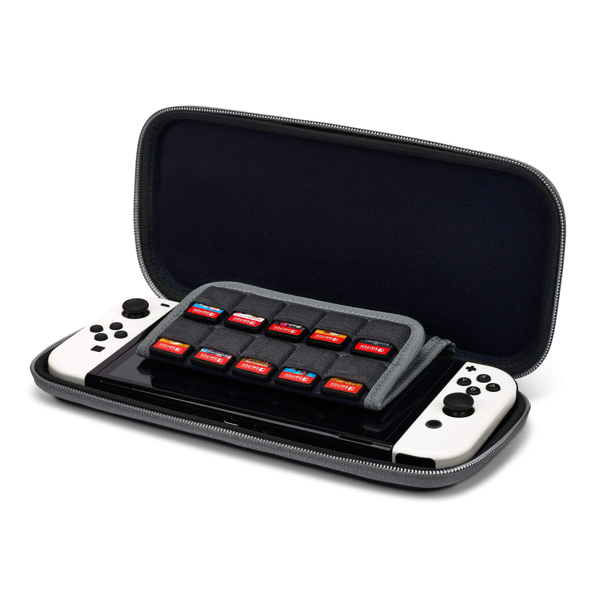Nehmen Sie Ihre Nintendo Switch (OLED-Modell), Nintendo Switch oder Switch Lite mit diesem schlanken Schutzetui. Modus geeignet ist, mit auf Reisen. Innen besitzt sie ein Fleecefutter und einen eingebauten Spielfuss mit Stauraum für 5 Softwarekarten sowie eine kleine Netztasche. Mit dieser tragbaren Hülle können Sie auch unterwegs Spass mit Ihrer Nintendo Switch haben. Überall. Jederzeit.