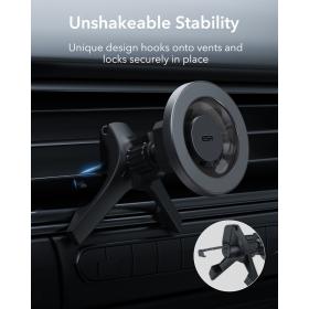 Hochwertige N52H-Magnete mit einer Haltekraft von 2.300 g halten Ihr Telefon sicher an Ort und Stelle; Kombinieren Sie es mit dem ESR HaloLock-Gehäuse für das stärkste Magnetschloss; kabelloses Laden wird nicht unterstützt. 360°-Magnetring passt perfekt zum Magnetsystem der iPhone 12-Serie oder neuer, für eine schnelle und einfache Montage mit nur einem Fingertipp. Das einzigartige Design lässt sich an den Lüftungsschlitzen einhängen und rastet fest ein, während die Montagearme die Stabilität weiter verbessern und für Seelenfrieden und einen stabilen Schutz selbst auf den holprigsten Strassen sorgen. Funktioniert mit allen Arten von Lüftungsschlitzen im Auto, horizontal, vertikal, kreisförmig oder schraffiert, über einen leicht drehbaren Haken; kann nur mit der iPhone 12-Serie oder höher verwendet werden. Wechseln Sie sofort zwischen Hochformat für Freisprechanrufe und Querformat für die Navigation und erhalten Sie den perfekten Winkel für Sie.