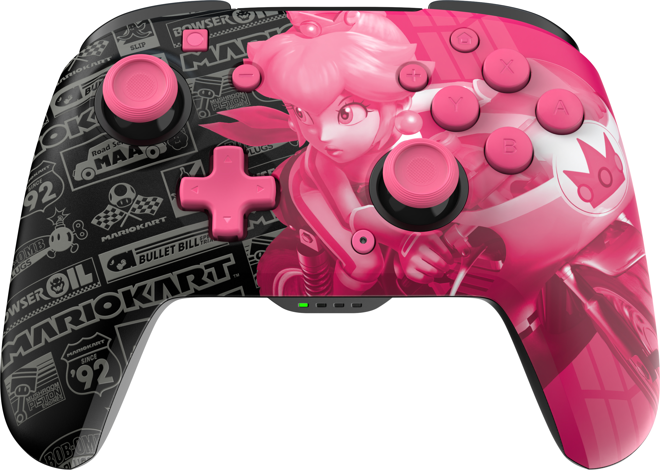Der kabellose Grand Prix Peach REMATCH GLOW Controller verleiht deinem Spiel mit seinem einzigartigen Design, das nach Lichteinfall im Dunkeln leuchtet, neuen Schwung. Mit seiner 40-stündigen Akkulaufzeit müssen Sie vor dem Controller aufhören, und da er wiederaufladbar ist, schonen Sie den Planeten und Ihr Bankkonto. Dank der kabellosen Reichweite von bis zu 30 Metern kannst du es dir nach einem langen Spieltag auf der Couch gemütlich machen. Programmiere andere Tastenfunktionen auf die beiden hinteren Tasten für schnellere Aktionen im Spiel und ein individuelles Spielerlebnis. Bringen Sie Ihr Spiel zum Glühen mit dem offiziell lizenzierten REMATCH GLOW Wireless Controller für Nintendo Switch™.