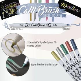 Die Calli.Brush Double Tip Brushpens Metallic sind besonders gut für dunkle Papiere geeignet. In Sachen Qualität überzeugend auf ganzer Linie: intensiv pigmentierte Farben und zwei langlebige Künstlerspitzen. Die 2,5 mm Kalligrafie-Spitze und die biegsame Pinselspitze erlauben eine grosse Vielfalt an Schriftbreiten und -varianten mit zahlreichen Gestaltungsmöglichkeiten. Die fünf Metallicfarben entfalten ihre schimmernde Wirkung besonders gut auf dunklen Papieren: Mit den perfekt aufeinander abgestimmten Farbtönen Metallic Gold, Metallic Silver, Metallic Green Metallic Red, Metallic Blue lässt sich kreativ arbeiten und kombinieren. Die Calli.Brush Pens sind gut für Einsteiger geeignet.