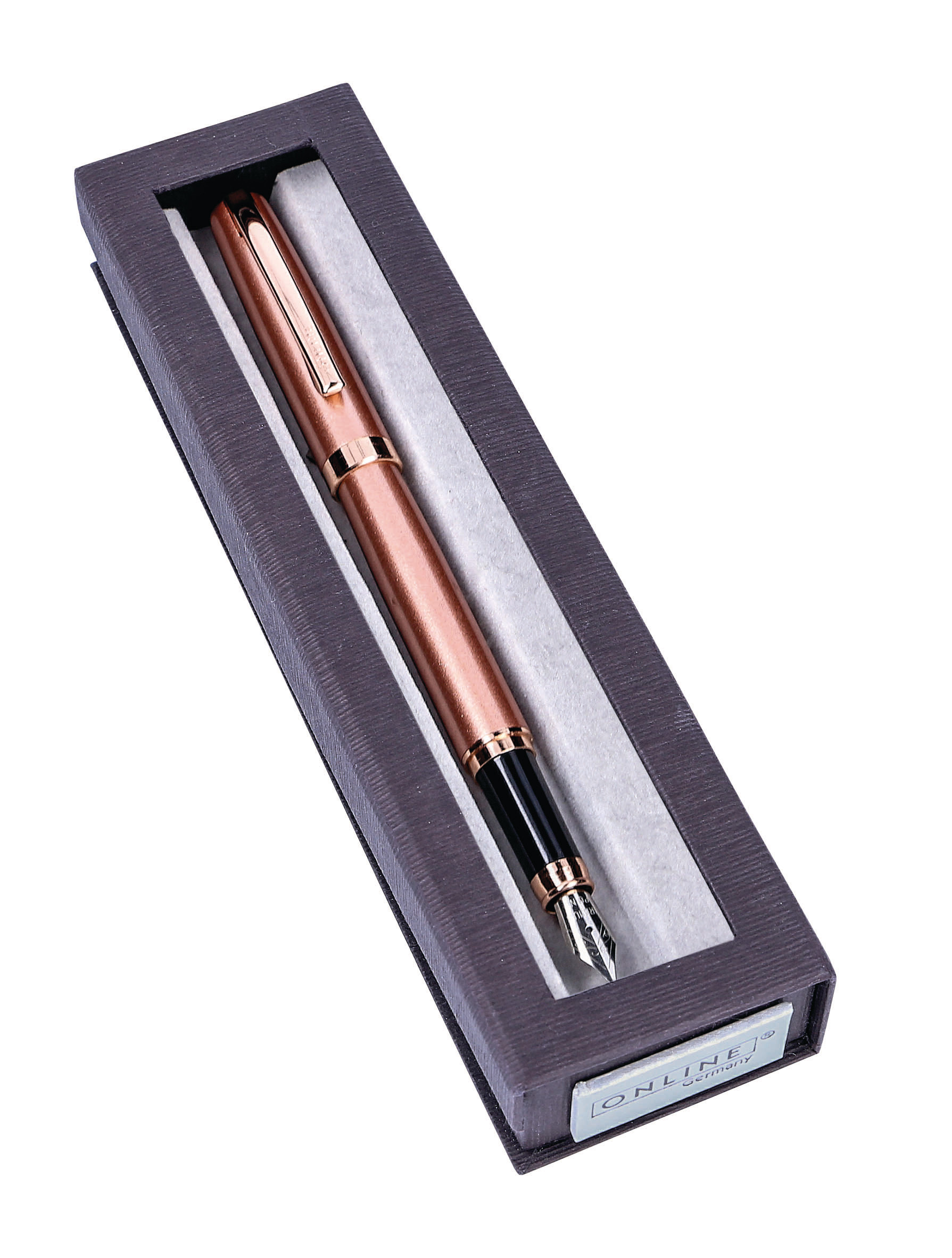 Der Design-Metall-Füllhalter von ONLINE mit mattierter Oberfläche. Ausgestattet mit einer eleganten Iridium-Feder M (mittel) bietet der Füller höchsten Schreibkomfort. In der mitgelieferten Geschenkbox ist jedes dieser Schreibgeräte eine elegante Geschenkidee. Nachfüllbar mit Standard Tintenpatronen (zwei kurze Patronen oder eine lange), Konverter-Einsatz möglich. Auf die edle Iridium-Feder gewährt ONLINE 5 Jahre Garantie.
