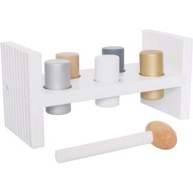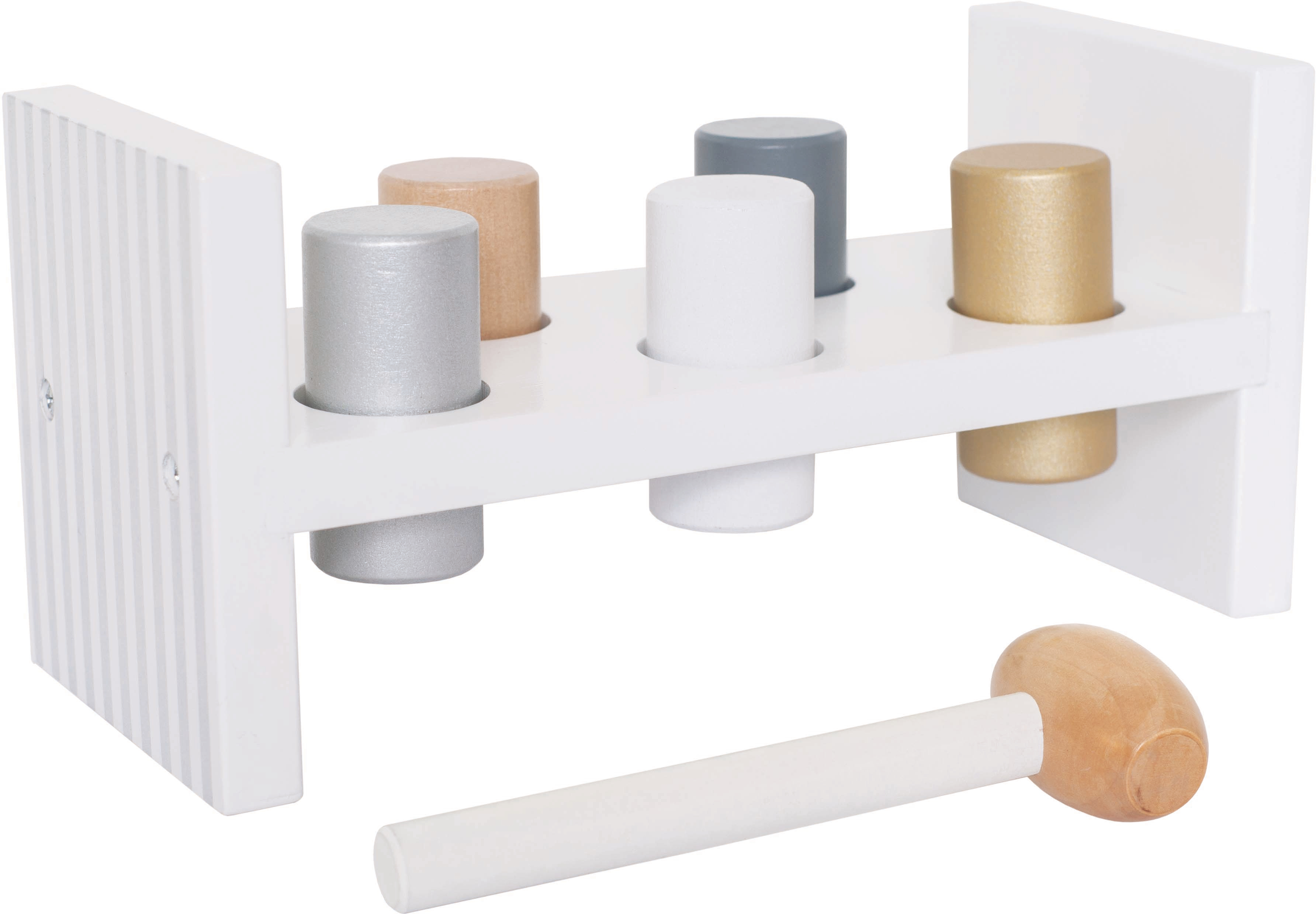 Hammer Bank in Silber und Gold. Sie ist ein lustiges Spielzeug mit dem das Kind seine Hand- und Augenkoordination trainieren kann. Schlagen Sie alle Stifte mit dem Hammer ein, dann drehen Sie die Bank um und beginnen von vorne.
