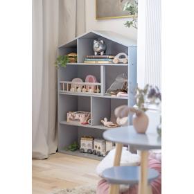 Graues stilvolles Bücherregal das wunderbar ins Kinderzimmer passt. Es siehtaus wie ein grosses Puppenhaus und hat viel Platz für d ie Lieblingsbücher und Spielzeug der Kinder.