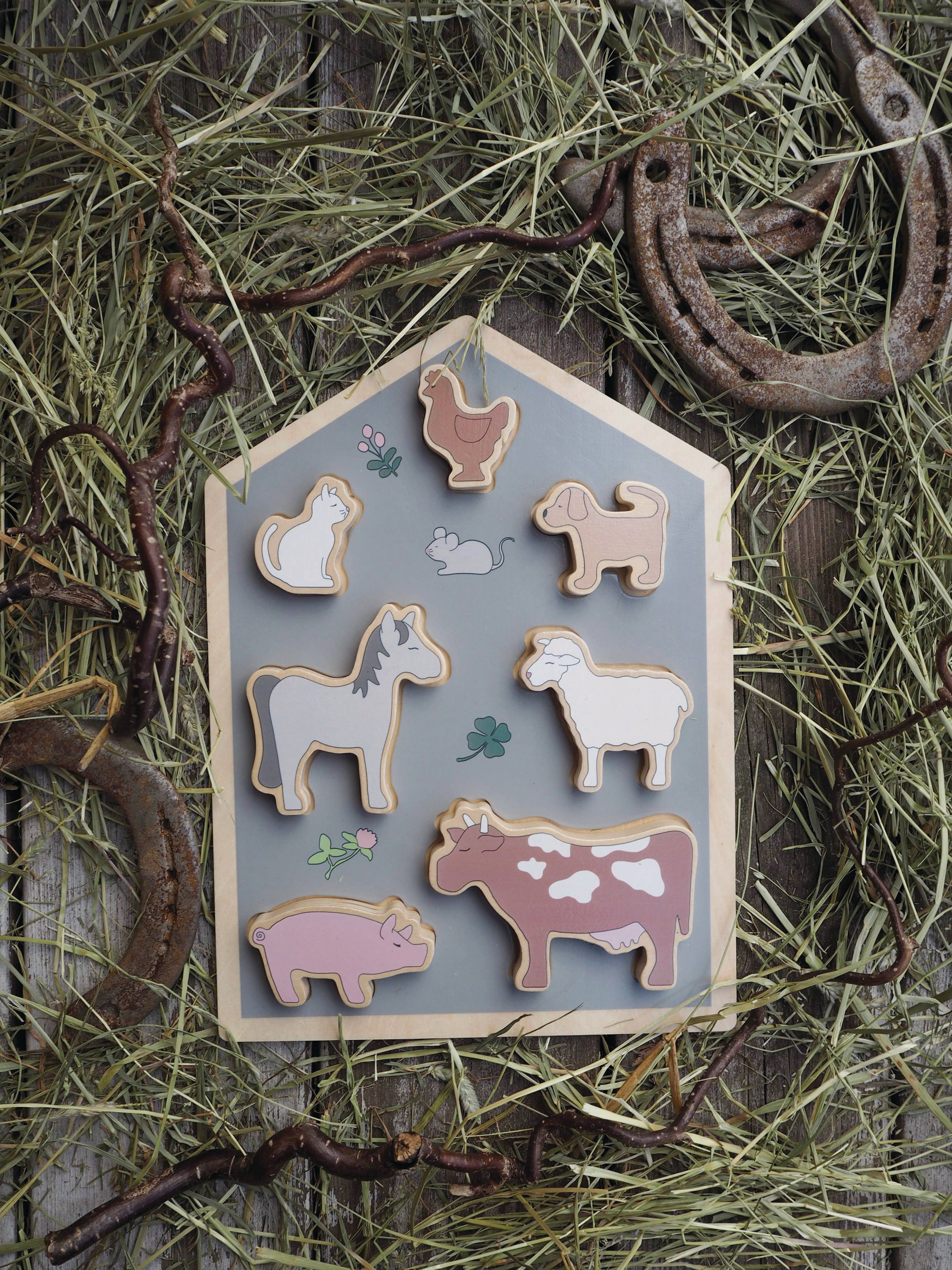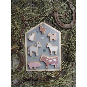 Ein schöngemachtes Holzpuzzle mit den häufigsten Tieren vom Bauernhof.