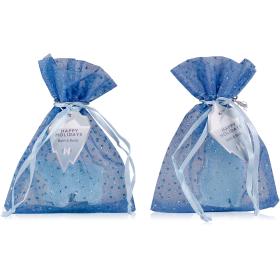In dem blauen Organzabeutel schön verpackt ist eine Schafmilchseife entweder in Form von einem Eisbär oder Pinguin.