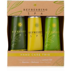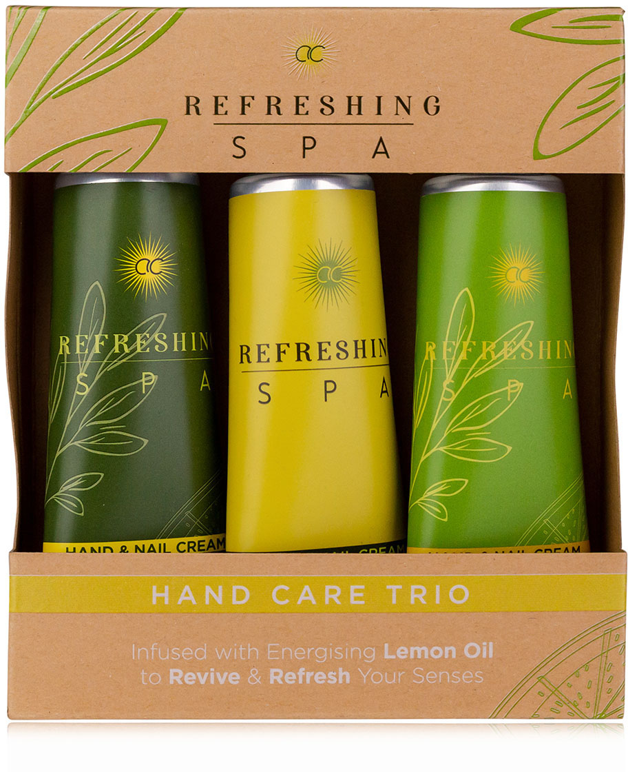 Handpflegeset REFRESHING SPA in Geschenkbox, inkl. 3 x 60ml Hand- & Nagelcreme, angereichert mit Zitronenöl, Duft: Lemon & Jasmine, Farbe: grün/gelb/braun, VE 6/24