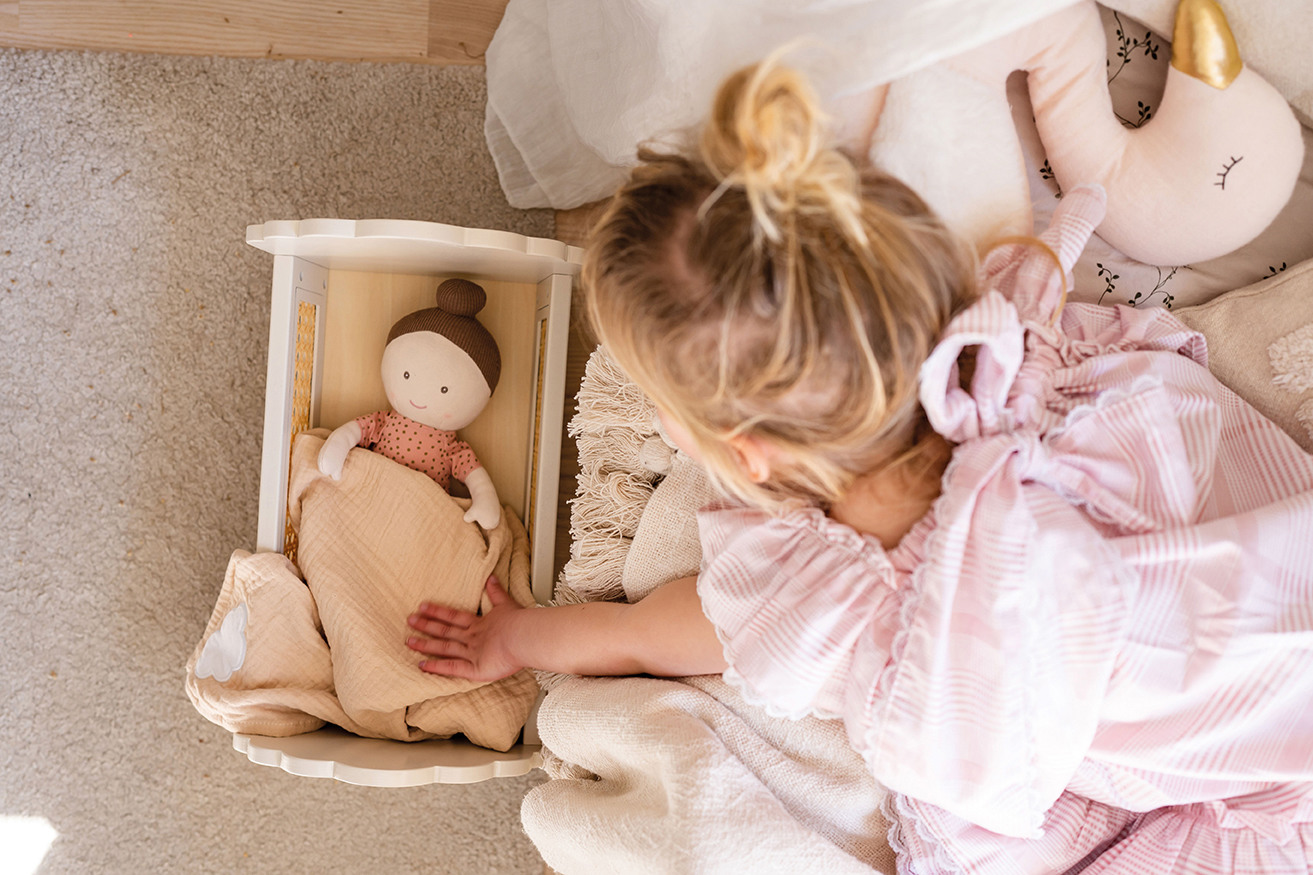 Jetzt wird die Puppe einen süssen Schlaf haben! Die Puppenwiege von Jabadabado hat eine schöne cremefarbene Farbe und dekorative rattanartige Details. Legen Sie die Puppe oder das Plüschtier ins Bett und wiegen Sie Ihren kleinen Freund in den Schlaf. Es handelt sich um ein klassisches Spielzeug, das perfekt ins Kinderzimmer passt. Zur gleichen Serie von Jabadabado gehören auch ein passender Puppenstuhl und ein Puppenwagen, die das Spiel noch lustiger und fantasievoller machen. Kinder spielen gerne das, was Erwachsene im wirklichen Leben tun, also lassen Sie Ihre Kleinen ihre eigenen Puppen bekommen, um die sie sich kümmern können. Ermutigt zu kreativen Rollenspielen.