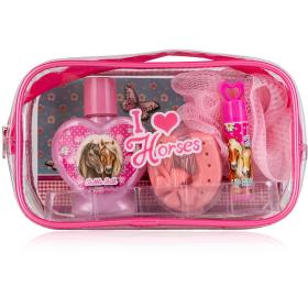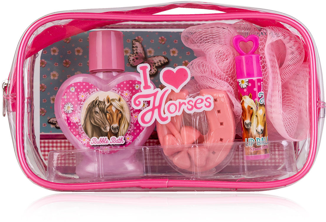 Badeset I LOVE HORSES in Kosmetiktasche, inkl. 80ml Schaumbad, 20g Seife, 4g Lippenbalsam, 10g Schwamm