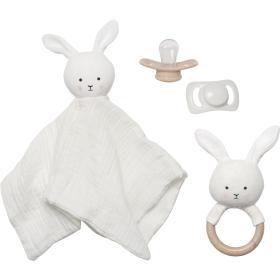 Dieses Babygeschenk ist gefüllt mit bezaubernden Produkten, die in der Familie nicht mehr wegzudenken sind. Baby Kuscheldecke: Die Kuscheldecke aus 100 % Musselin-Baumwolle ist für gemütliche Nickerchen und Kuschelstunden im Bett gedacht und ist der perfekte Begleiter für warme und zärtliche Momente. Babyrassel aus Holz: Die niedliche Textilrassel mit Holzgriff regt die Sinne des Babys an und ist ein ideales Spielzeug für die Entwicklung des Kindes. Baby-Schnuller. Ein Zweierpack Schnuller aus schwedischer Produktion wird das Baby mit Komfort und Süsse beruhigen.