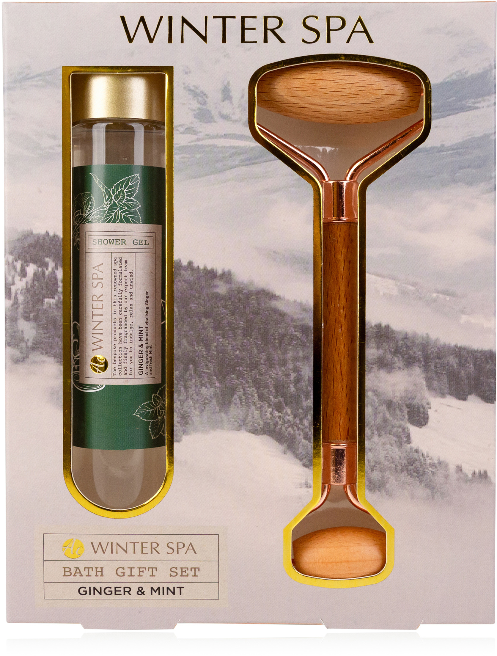 Badeset WINTER SPA in Geschenkbox, inkl. 60ml Duschgel, Massageroller aus Holz, Duft: Ginger & Mint, Farbe: grün/gold/grau, VE 6/24