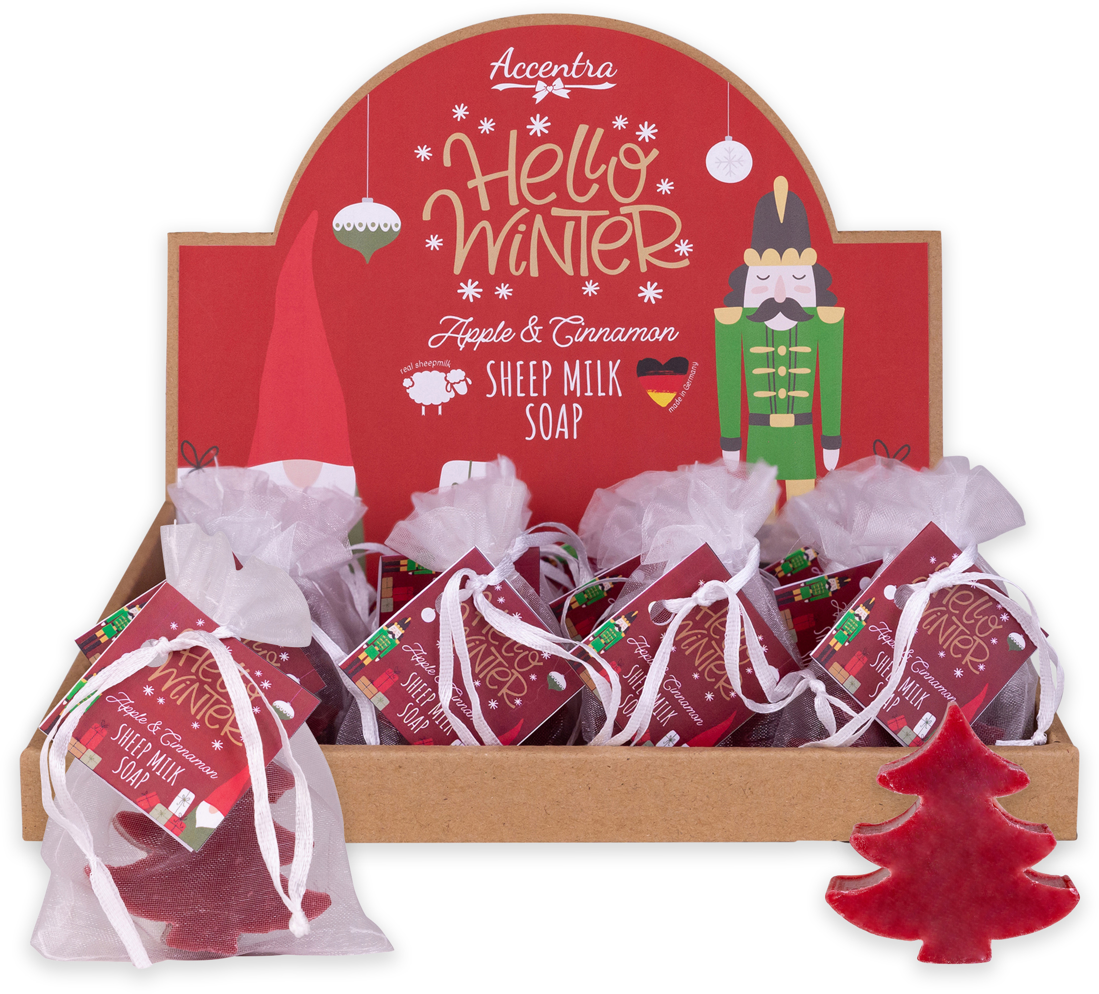Handgefertigte Schafmilchseife HELLO WINTER in Organzabeutel, Frischgewicht 25g, Duft: Apple & Cinnamon, Farbe: rot/grün/gold, VE 24 im Display