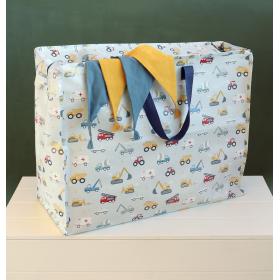Diese grosse Aufbewahrungstasche mit Fahrzeuge-Aufdruck ist ideal für die Aufbewahrung von Kleidung, Decken und Spielzeug, kann aber auch ideal als Strand- oder Badetasche verwendet werden. Die Tasche besteht aus recyceltem Plastik und wird mit einem Reissverschluss geschlossen. Die Tasche kann auch leicht zusammengefaltet werden, was sie praktisch für die Aufbewahrung macht.