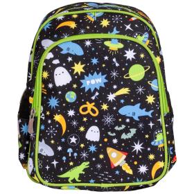Der praktische schwarze Rucksack mit Raketen, Planeten und Sternen ist ideal für die Schule oder für Ausflüge. Der Kinderrucksack hat ein geräumiges Hauptfach, eine isolierte Fronttasche und zwei offene Seitentaschen; gross genug für eine Brotdose, ein Pausenbrot und eine Wasserflasche. Der Rucksack hat gepolsterte Schultergurte und einen Brustgurt, so dass er nicht so leicht von den Schultern rutscht. Die Rückenpartie ist mit einem atmungsaktiven Stoff gefüttert, der für zusätzlichen Komfort sorgt.