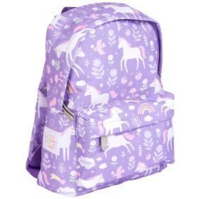 Der kleine, lilafarbene Rucksack mit Einhörnern, Blumen und Regenbögen ist ideal für die Schule oder die Kita. Der Rucksack für Kleinkinder hat ein geräumiges Hauptfach und eine Vordertasche mit Reissverschluss. Ausserdem hat der Rucksack gepolsterte Schultergurte und eine Rückenplatte. Der Rucksack hat auch einen Brustgurt, damit er nicht so leicht von den Schultern fällt.