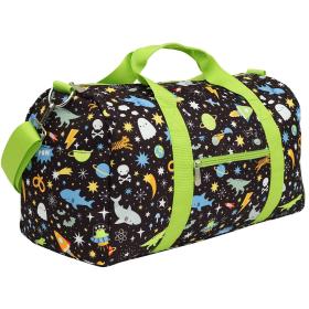 Die geräumige schwarze Wochenendtasche mit Raketen, Planeten und Sternen ist ideal für den Urlaub oder eine Pyjama-Party. Die Aufteilung der Tasche umfasst ein Hauptfach mit zusätzlicher Tasche, zwei Seitentaschen und eine Reissverschlusstasche vorne. Die Tasche hat unten Nieten, einen Doppelgriff und einen verstellbaren und abnehmbaren Schultergurt. Darüber hinaus eignet sich die Tasche auch ideal als Sporttasche. Geeignet als Handgepäck (überprüfen Sie immer die Richtlinien der Fluggesellschaft).