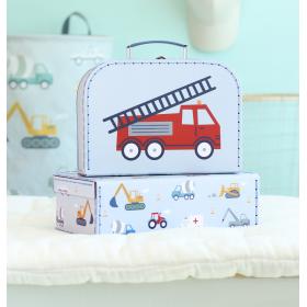Das hellblaue Karton-Kofferset mit Autos, LKWs und Traktoren ist zur Aufbewahrung von Gegenständen wie Windeln oder als Dekoration für das Kinderzimmer gedacht. Das Set besteht aus zwei unterschiedlich großen Koffern und besteht aus stabilem Karton mit Polyesternähten. Beide Koffer verfügen über einen Metallgriff und eine Schnalle zum Verschließen des Koffers.