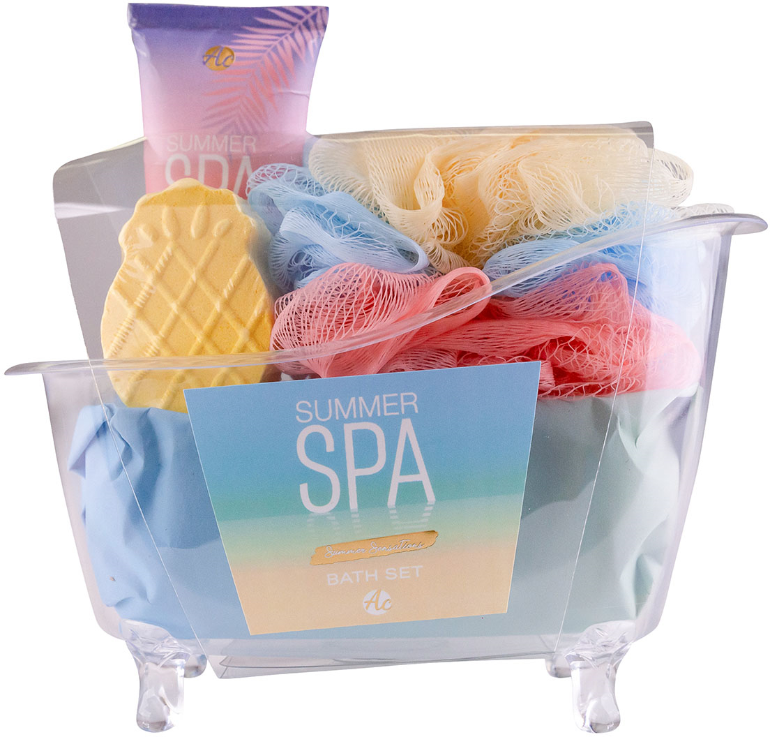 Badeset SUMMER SPA in dekorativer Mini-Badewanne, ideal für entspannte Wellnessmomente. Enthält: - 60 ml Duschpeeling für sanfte Hauterneuerung, - 40 g Shower Steamer für aromatischen Dampfgenuss, - 40 g Netzschwamm für einen erfrischenden Schaum. Duft: Summer Sensations – ein sommerlicher Wohlfühltraum für Körper und Sinne!