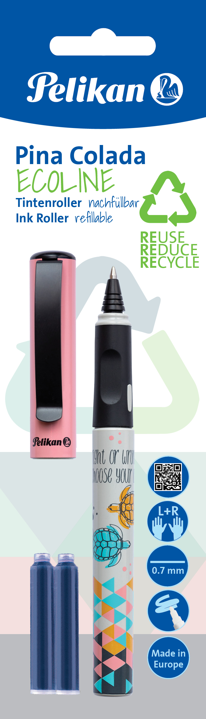 Umweltfreundlicher Tintenroller mit Patronen-Nachfüllsystem. Kunststoff der Kappe und des Schafts aus recyceltem Material. Nachfüllbar mit Standard-Tintenpatronen. Sofortiges und flüssiges Schreiben. "Cap Off Ink" für 7 Tage.
