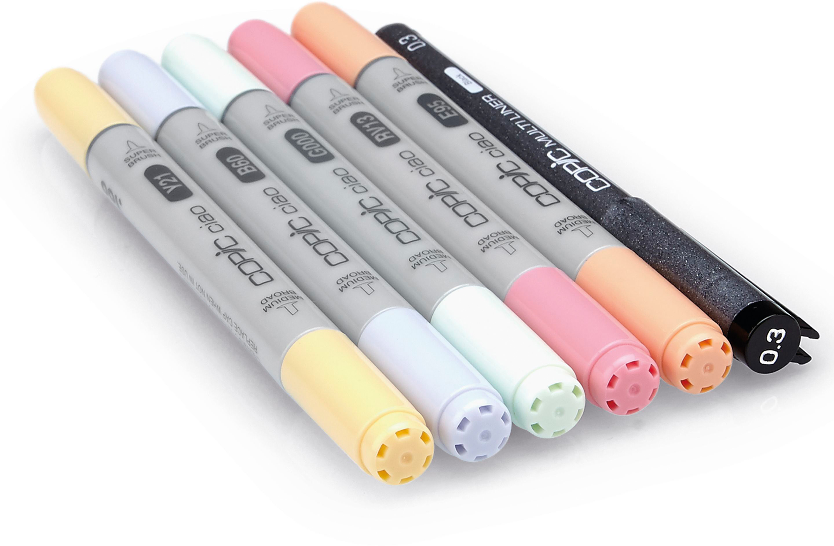 Copic Ciao 5+1 Set Pastellfarben. Jedes 5+1"-Set beinhaltet 5 x Copic Ciao Marker, die mit einer Medium Broad sowie einer Super Brush Pinselspitze ausgestattet sind. Das "+1" steht für den Mehrwert eines zusätzlich beigefügten Multiliners mit 0.3 mm Spitze. Ideal um Konturen oder komplette Zeichnungen herzustellen. Enthaltene Farben: Y21, B60, G000, RV13, E95.