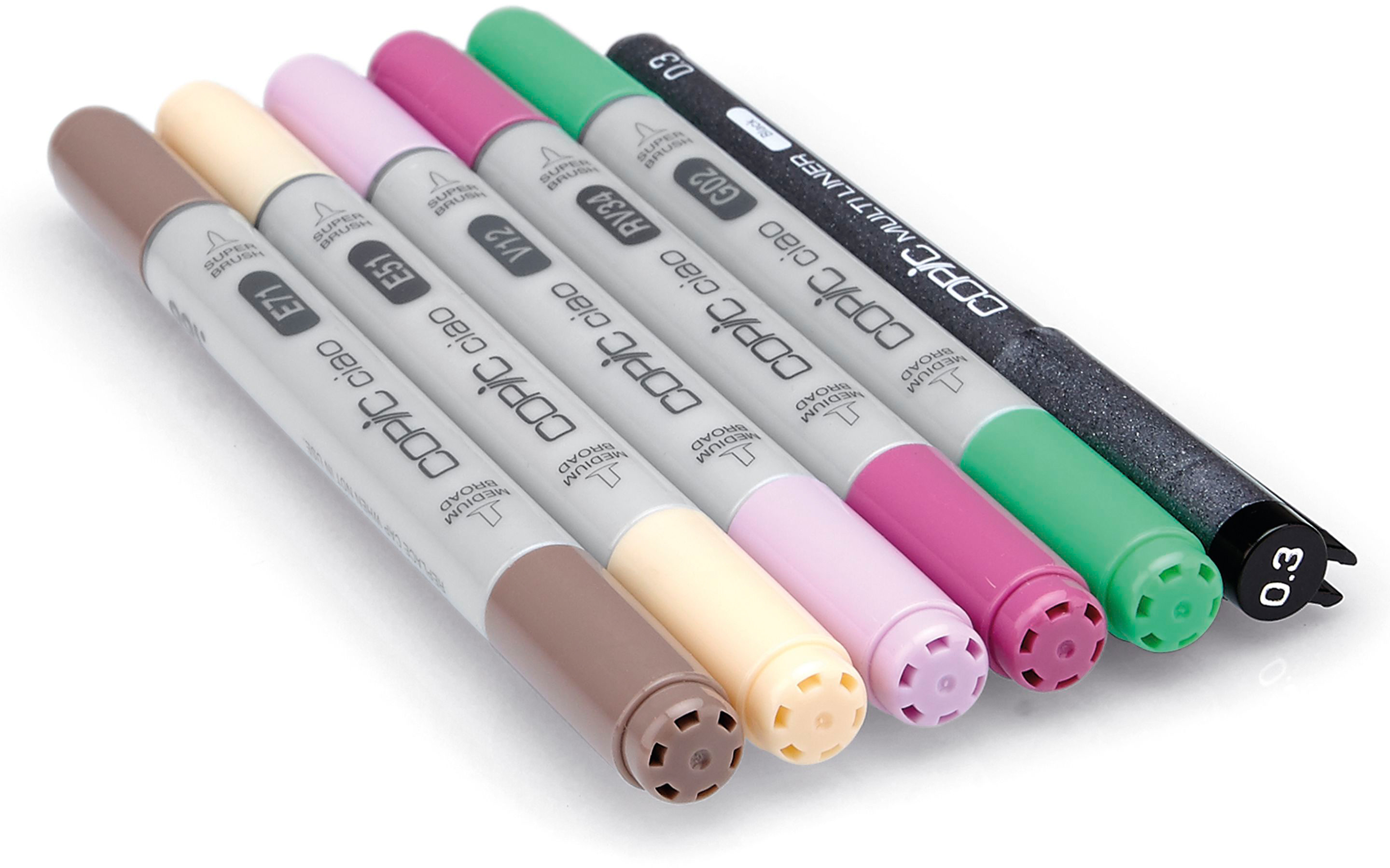 Copic Ciao 5+1 Set Manga 3. Jedes 5+1"-Set beinhaltet 5 x Copic Ciao Marker, die mit einer Medium Broad sowie einer Super Brush Pinselspitze ausgestattet sind. Das "+1" steht für den Mehrwert eines zusätzlich beigefügten Multiliners mit 0.3 mm Spitze. Ideal um Konturen oder komplette Zeichnungen herzustellen. Enthaltene Farben: E71, E51, V12, RV34, G02.