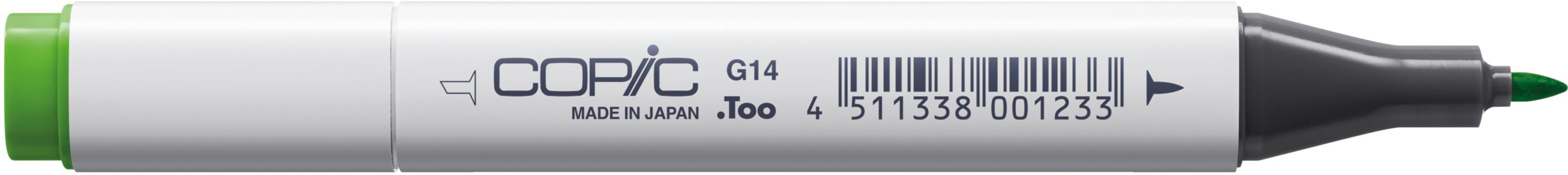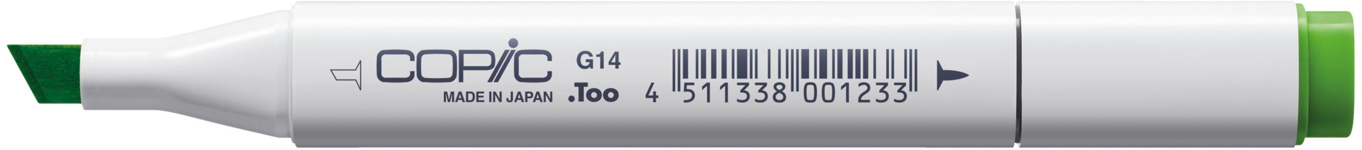 Copic Marker G14, Apple Green. Professioneller Copic Layoutmarker in 213 Farben (+ neutralem Blender), ausgestattet mit einer breiten und einer feinen Polyester-Spitze. Für unterschiedliche Anwendungen ist er ausserdem mit 7 weiteren Spitzen umrüstbar (inkl. Kalligrafie-Spitze). Der Copic Marker ist das ideale Handwerkszeug für professionelle Gestalter wie Grafiker, Architekten, Mode- und Industrie-Designer. Ideal für die Layout- & Entwurfstechnik, für Illustrationen, Scribbles & Storyboards, Stoffdesigns, Airbrush-Arbeiten, technische Zeichnungen, Kalligrafien etc. Das umfangreiche Copic Zubehör, das ständig erweitert und ergänzt wird, macht unterschiedliche Anwendungen möglich. Die Tinte des Copic Markers ist auf Alkoholbasis, toxikologisch unbedenklich und nahezu geruchlos. Sie trocknet schnell und verwischt nicht. Alle erhältlichen Farben (inklusive 44 Grautönen), können mit Copic Ink farbidentisch wieder aufgefüllt werden. Mit einer einzigen Copic Ink Nachfüllflasche kann der Marker 5 x nachgefüllt werden. Das garantiert ein optimales Kosten-Nutzen-Verhältnis, ist umweltfreundlich und wirtschaftlich.