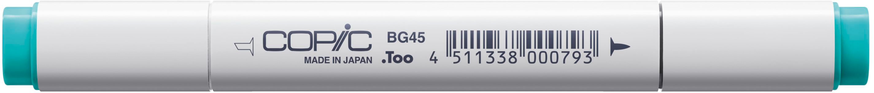Copic Marker BG45, Nile Blue. Professioneller Copic Layoutmarker in 213 Farben (+ neutralem Blender), ausgestattet mit einer breiten und einer feinen Polyester-Spitze. Für unterschiedliche Anwendungen ist er ausserdem mit 7 weiteren Spitzen umrüstbar (inkl. Kalligrafie-Spitze). · Der Copic Marker ist das ideale Handwerkszeug für professionelle Gestalter wie Grafiker, Architekten, Mode- und Industrie-Designer · Ideal für die Layout- & Entwurfstechnik, für Illustrationen, Scribbles & Storyboards, Stoffdesigns, Airbrush-Arbeiten, technische Zeichnungen, Kalligrafien etc. · Das umfangreiche Copic Zubehör, das ständig erweitert und ergänzt wird, macht unterschiedliche Anwendungen möglich · Die Tinte des Copic Markers ist auf Alkoholbasis, toxikologisch unbedenklich und nahezu geruchlos · Die Tinte trocknet schnell und verwischt nicht · Alle erhältlichen Farben (inklusive 44 Grautönen), können mit Copic Ink farbidentisch wieder aufgefüllt werden · Mit einer einzigen Copic Ink Nachfüllflasche kann der Marker 5 x nachgefüllt werden. Das garantiert ein optimales Kosten-Nutzen-Verhältnis, ist umweltfreundlich und wirtschaftlich.
