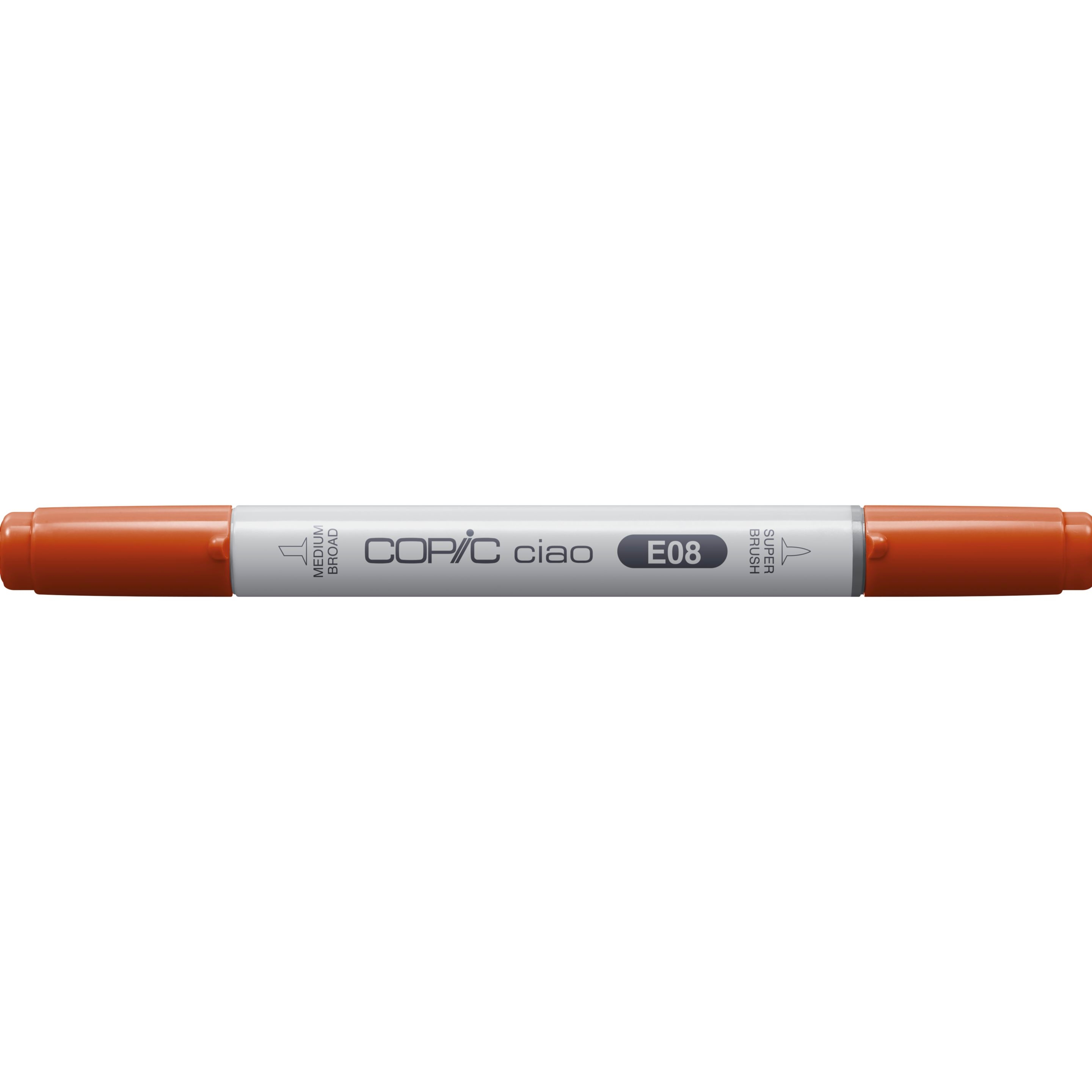 Copic Ciao Marker E08, der preisgünstige, doppelseitige Allround-Marker in 180 Farben. Der Copic Ciao bietet Newcomern viele Produktvorteile, die bereits den Copic classic und den Copic Sketch aus dem Profilager ausgezeichnet haben. Ausgestattet mit einer universell einsetzbaren, mittelbreiten Spitze, verfügt er ausserdem über eine flexible Pinselspitze. Mit dieser können weiche Striche mit interessanten Modulationen erzielt werden. Der Ciao Marker ist daher für Modedesign und Kalligrafie, zum Skizzieren, Scribblen und Layouten perfekt einsetzbar. Insbesondere Hobbykünstler & Mangaka bevorzugen den Copic Ciao, u.a. zum Kolorieren von Scrapbookings, Stempelkunst und handgemachten Karten. Die eingefärbten Kappen ermöglichen eine schnelle und exakte Identifizierung der Farbtöne. Die 180 leuchtenden Farben auf Alkoholbasis sind toxikologisch unbedenklich und nahezu geruchlos. Die Tinte trocknet schnell, verwischt nicht und kann auf der Fläche gemischt und übereinandergelegt werden. Alle erhältlichen 180 Farben können mit Copic Ink farbidentisch wieder aufgefüllt werden. Mit einer einzigen Nachfüll-Flasche kann der Marker 9 x wieder aufgefüllt werden. Das garantiert ein optimales Kosten-Nutzen-Verhältnis, ist umweltfreundlich und wirtschaftlich.