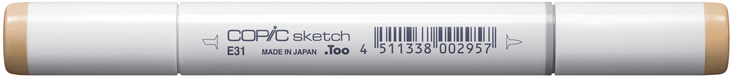 Copic Sketch Marker, E31. Professioneller Pinselmarker Copic Sketch in 358 Farben (+ neutralem Blender). Ausgestattet mit einer speziell entwickelten "Super Brush"-Spitze und einer "Medium Broad"-Spitze. (Spitzen austauschbar.) Ideal für Scribbles, Layouts, Storyboards, Illustrationen, Skizzen, Modedesigns und Kalligrafien. Auch im Hobbybereich für Comic- & Mangazeichnungen, Stempelkunst & Scrapbooking sowie für alle Anwender, die einem Pinselmarker den Vorzug geben. Der Copic Sketch ist einsteckbar in das Copic Airbrushing-Layoutsystem. Die Tinte ist identisch mit der des klassischen Copic Markers: Auf Alkoholbasis, toxikologisch unbedenklich und nahezu geruchlos. Sie trocknet schnell und verwischt nicht. Alle erhältlichen 358 Farben können mit Copic Ink farbidentisch wieder aufgefüllt werden. Mit einer einzigen Nachfüll-Flasche kann der Copic Sketch Marker 7 x wieder aufgefüllt werden. Das garantiert ein optimales Kosten-Nutzen-Verhältnis, ist umweltfreundlich und wirtschaftlich.