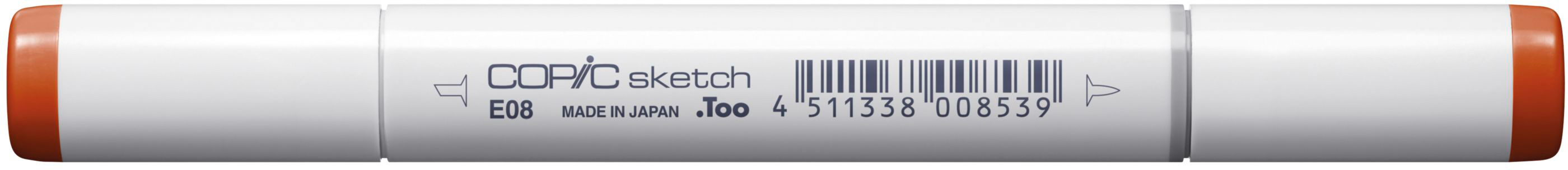 Copic Sketch Marker, E08. Professioneller Pinselmarker Copic Sketch in 358 Farben (+ neutralem Blender). Ausgestattet mit einer speziell entwickelten "Super Brush"-Spitze und einer "Medium Broad"-Spitze. (Spitzen austauschbar.) Ideal für Scribbles, Layouts, Storyboards, Illustrationen, Skizzen, Modedesigns und Kalligrafien. Auch im Hobbybereich für Comic- & Mangazeichnungen, Stempelkunst & Scrapbooking sowie für alle Anwender, die einem Pinselmarker den Vorzug geben. Der Copic Sketch ist einsteckbar in das Copic Airbrushing-Layoutsystem. Die Tinte ist identisch mit der des klassischen Copic Markers: Auf Alkoholbasis, toxikologisch unbedenklich und nahezu geruchlos. Sie trocknet schnell und verwischt nicht. Alle erhältlichen 358 Farben können mit Copic Ink farbidentisch wieder aufgefüllt werden. Mit einer einzigen Nachfüll-Flasche kann der Copic Sketch Marker 7 x wieder aufgefüllt werden. Das garantiert ein optimales Kosten-Nutzen-Verhältnis, ist umweltfreundlich und wirtschaftlich.