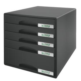 Gehäuse mit 5 Schubladen. 1 hohe und 4 flache Schubladen. Mit Griffloch im Schubladenboden der flachen Schubladen für die einfache Entnahme von Dokumenten. Geschlossene Schubladenfronten für kompletten Sichtschutz, mit ergonomischer Griffmulde in der Schubladenfront und integrierten Beschriftungsschildchen. Leicht laufende Schubladen mit Auszugssperre, mit rutschfesten Gummifüssen, stapelbar.
