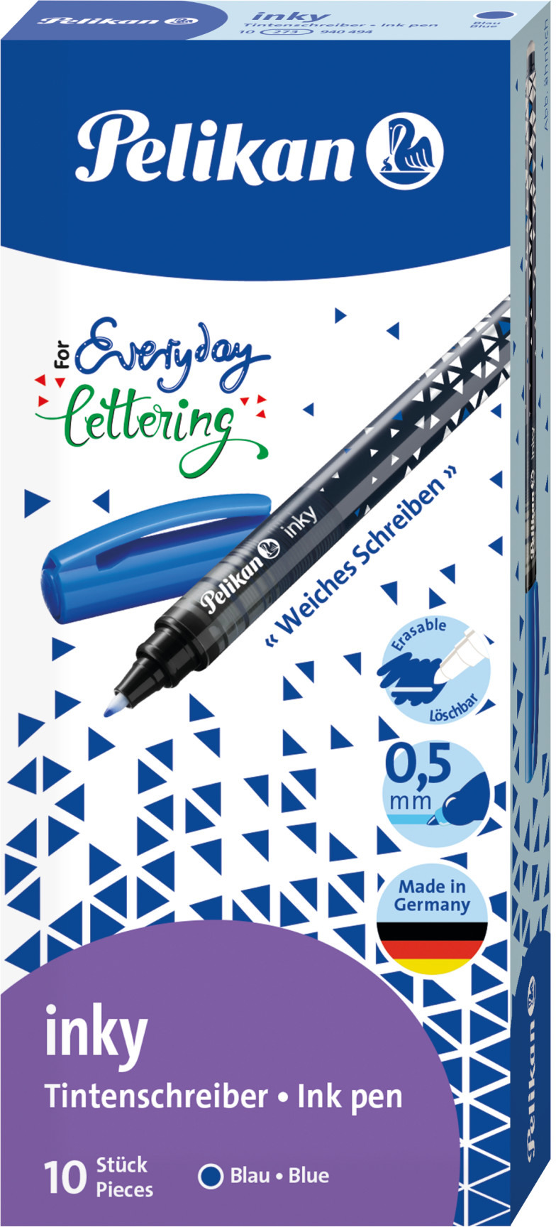 Tintenschreiber mit Tintenreglersystem. Schreibfarbe blau ist löschbar. Strichbreite ca. 0,5 mm. Spitze aus Kunststoff. Grosses Tintensichtfenster. Schaft: bedruckt, durchsichtig. Kappe in Schreibfarbe.