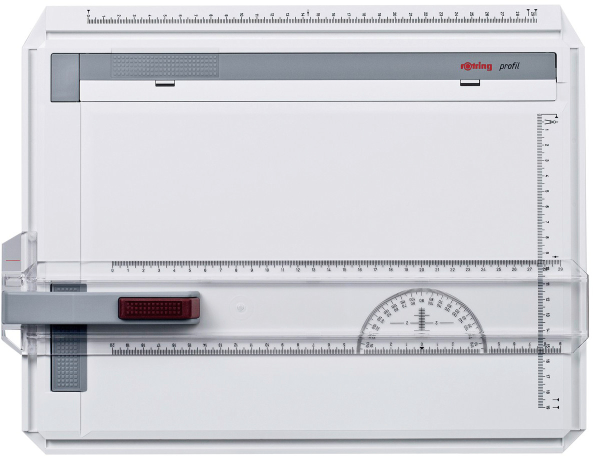 Zeichenplatte höchster Qualität mit L-förmiger Zeichenschiene. Stabiler Plattenkörper aus schlagfestem, beständigem Material. Parallel-Zeichenschiene mit STOP-and-GO-Mechanik. Ausserdem besitzt die Zeichenplatte eine Magnetklemmschiene.