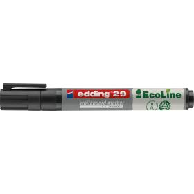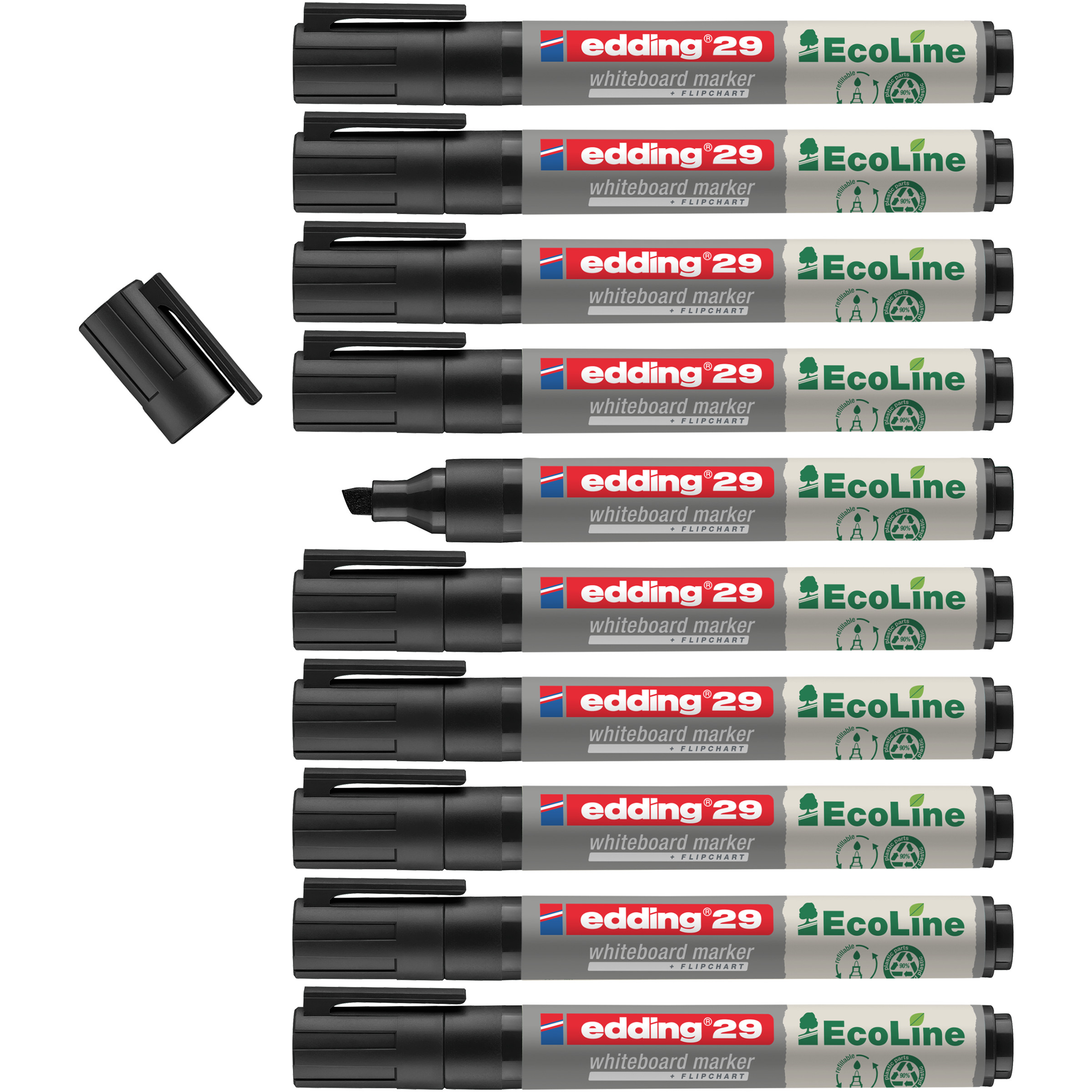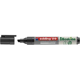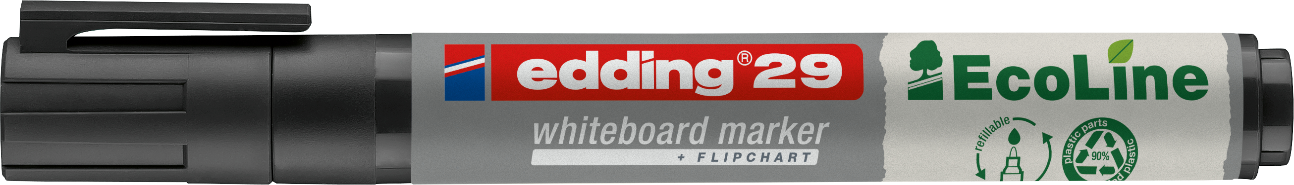 Whiteboardmarker zum Schreiben und Markieren auf Whiteboards, auch für Flipcharts geeignet. Die Kunststoffteile des Markers bestehen insgesamt mindestens zu 90% aus recyceltem Material (83% post-consumer). Klimaneutrales Produkt gemäss ClimatePartner-ID 13742-1910-1001. Trocken abwischbar von fast allen geschlossenen Oberflächen wie z.B. Emaille und Melamin. Die Keilspitze verfügt über eine Strichbreite von 1-5 mm. Dank der Cap-off-Technologie kann das Produkt einige Tage offen liegen bleiben, ohne auszutrocknen (Prüfklima nach ISO 554). Die Tinte des Whiteboardmarkers ist lichtbeständig und schnelltrocknend. Das Produkt ist nachfüllbar mit edding BTK 25 und edding BT 30 Nachfülltinte. Passende Ersatzspitzen (edding 29/363 Ersatzspitzen) sind erhältlich. Ohne Zusatz von Butylacetat.