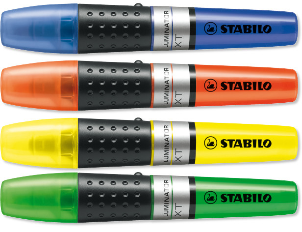 Textmarker STABILO LUMINATOR Tischset. Art der Schreibflüssigkeit: Tinte auf Wasserbasis, lichtbeständig. Tintenspeicher-Technik: Liquid-Ink-System. Läuft unter Druck nicht aus, z.B. im Flugzeug, extra grosser Tintenvorrat, Füllstandsanzeige zur ständigen Kontrolle, gleichmässige Tintenabgabe, hohe Offenlagerfähigkeit, mehrfach preisgekröntes Design.