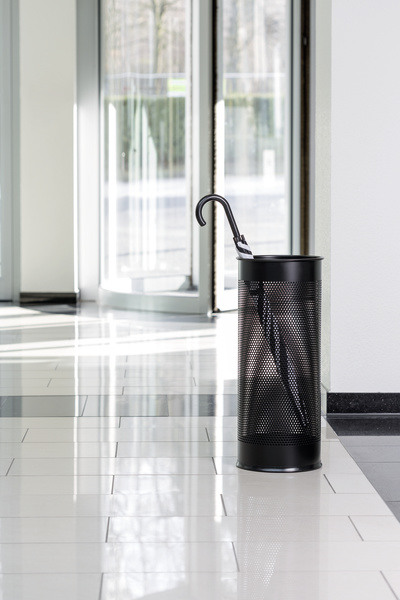 Stilvoll und eleganter Schirmständer mit dekorativem, perforiertem Streifen. Ideal für Eingangsbereiche, im Büro, im Ladengeschäft oder Zuhause. Hergestellt aus Metall mit Epoxidharz-Beschichtung.
