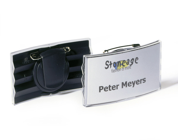 Attraktive Formgebung durch ein gewölbtes, glasklares Acrylfenster. Der elegante Kunststoffrücken wird durch einen drehbaren, strapazierfähigen Kunststoffclip mit Nadel im Hoch- oder Querformat befestigt. Grösse: 40 x 75 mm