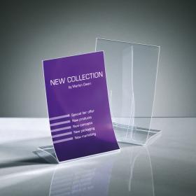 Klappbarer Tischaufsteller zur einseitigen Präsentation von beispielsweise Aktionen, Hinweisen oder Angeboten. Schnell aufgestellt und absolut standsicher. Zusammengeklappt ist er flach und leicht und somit für unterwegs geeignet. Aus glasklarem und bruchsicherem Hartplastik.