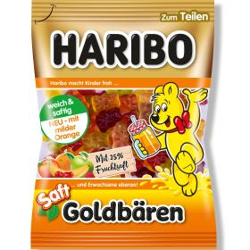 Die Saft Goldbären enthalten 25% Fruchtsaft und sind somit das saftigste Produkt im Haribo-Sortiment. In den fruchtigen Geschmacksrichtungen Apfel, Banane, Himbeere, Kirsche, milde Orange und Pfirsich sind sie ein echtes Genusserlebnis für die ganze Familie.