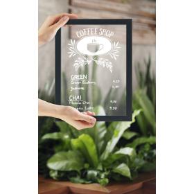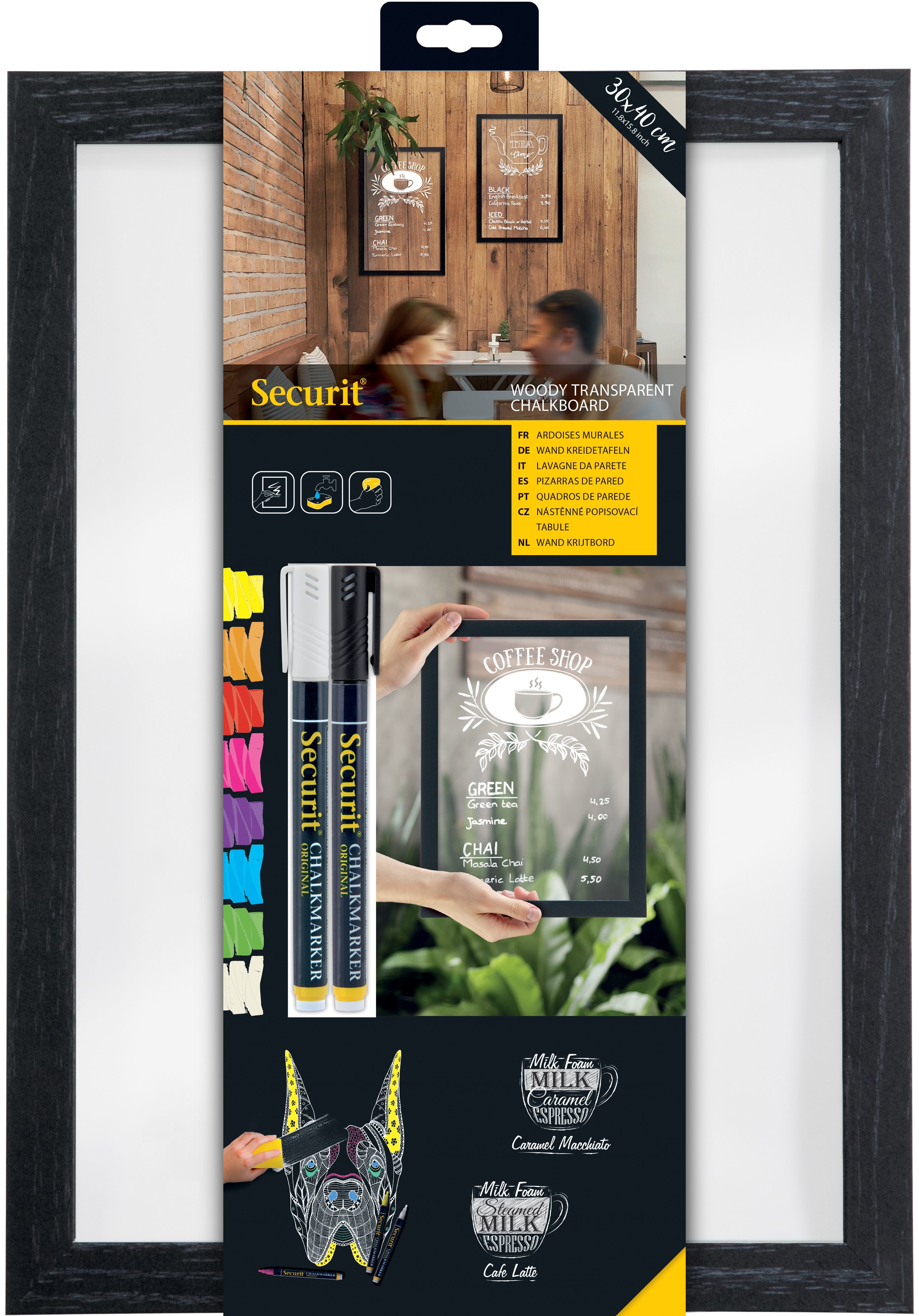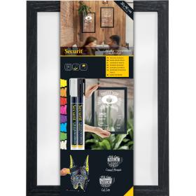 Kreidetafel mit Holzrahmen. UV-, stoss-, schmutz- und kratzbeständige Oberfläche mit non-poröser, doppelseitiger Schreiboberfläche. In verschiedenen Grössen erhältlich. Inklusive Wandmontageset und einem Securit® Kreidestift.