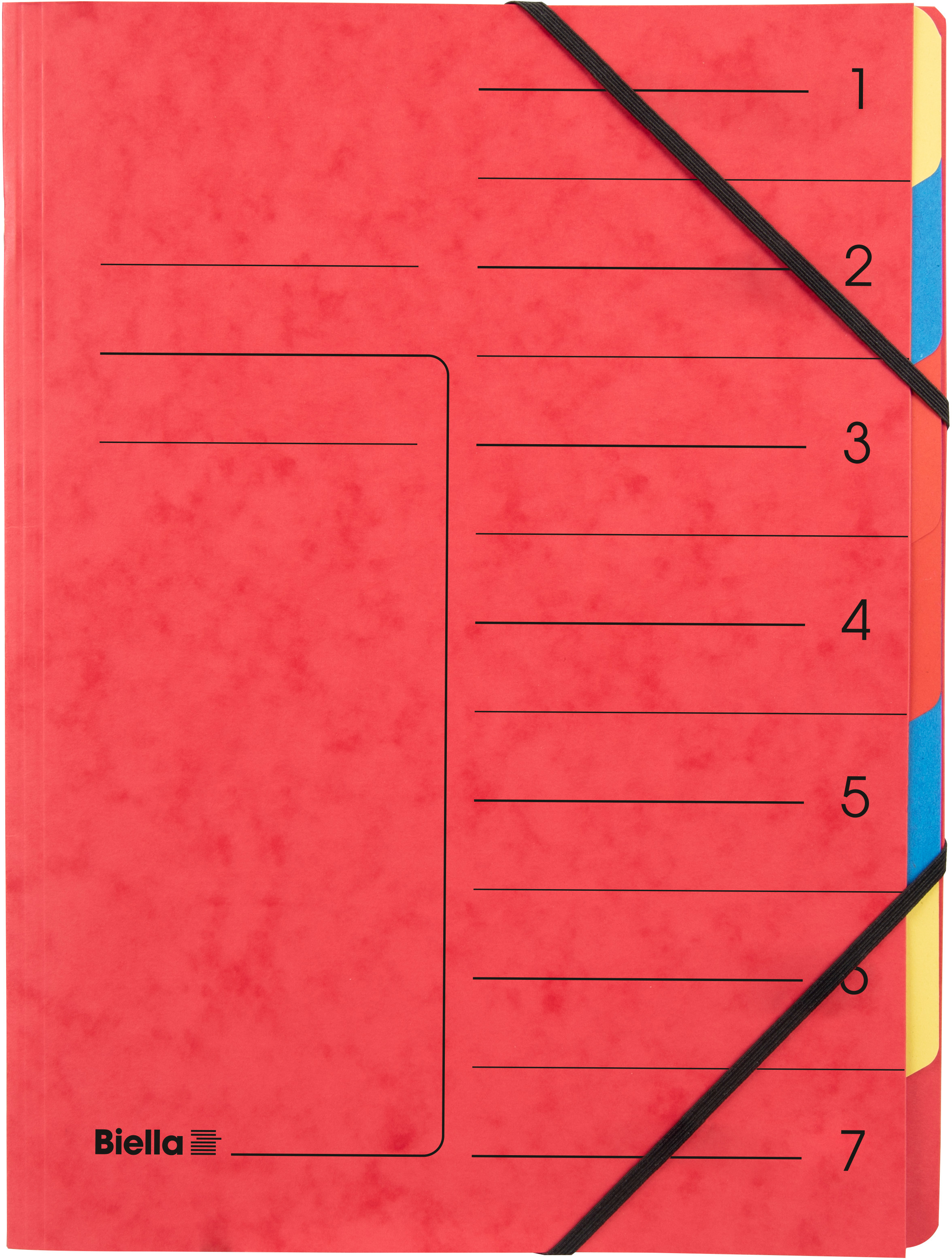 Für Format A4. Ordnungsmappe aus TopColor Karton 400 gm² geheftet mit 7 oder 12 Fächern und Gummizug, für Format DIN A4. TopColor Karton für den Einband und Karton aus Neufasern für den Innenteil. Inkl. Gummiband.