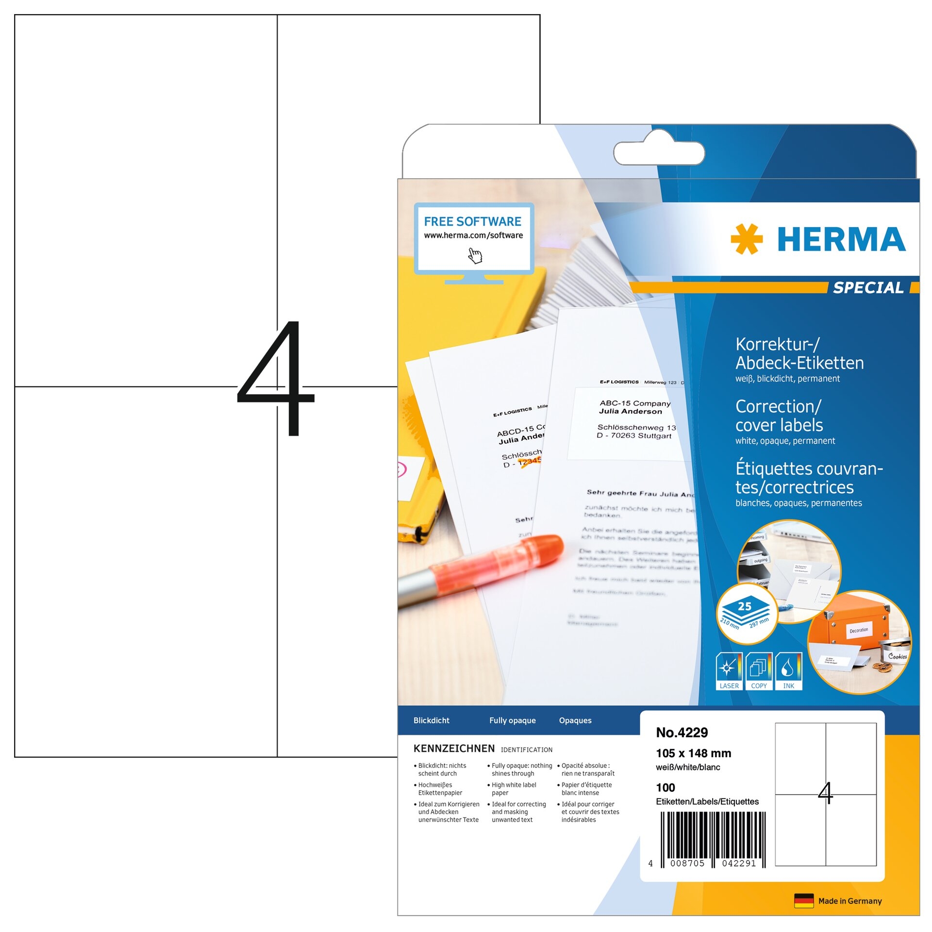 Blickdichte Korrektur/Abdecketiketten, auf A4-Blättern, selbstklebend. Ideal zum Überkleben, Abdecken und Korrigieren von unerwünschten oder fehlerhaften Texten und Bildern oder auf farbigem Untergrund. Absolut deckend - nichts scheint durch. Umweltfreundlich: hochwertiges, chlorfrei gebleichtes Spezialpapier, PEFC-zertifiziert, lösemittelfreier Haftkleber, 100 % recyclingfähig mit dem Altpapier. Sehr gute Druckergebnisse auf allen Laser- und Inkjetdruckern, Kopierern, Farblaserdruckern und Farbkopierern. Störungsfreie Verarbeitung durch Rundum-Sicherheitskante und optimale Planlage. Kostenlose Softwarelösungen: www.herma.de/software.