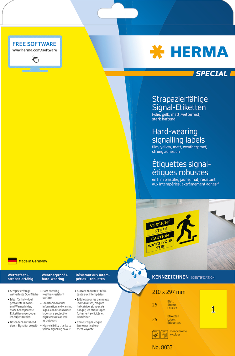 Weisse matte Folien-Etiketten auf A4-Blättern, selbstklebend. Ideal für stark beanspruchte Etikettierungen und im Aussenbereich: Eigentumsetiketten, Schaufensteraufkleber, Hinweis- und Warnschilder, Kennzeichnungen in Lager und Produktion. Strapazierfähige wetterfeste Oberfläche, besonders stark haftend, alterungsbeständig, Öl und Schmutz abweisend, abwaschbar, temperaturbeständig von -30 bis +80 °C. Störungsfreie Verarbeitung durch Rundum-Sicherheitskante und optimale Planlage. Für Laserdrucker und Kopierer, Farblaserdrucker und Farbkopierer. Nicht für Inkjetdrucker geeignet. Kostenlose Softwarelösungen: www.herma.de/software.