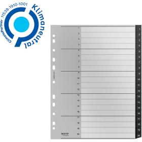 Umweltfreundliches, robustes Register in Premiumqualität. Hergestellt aus 90% recyceltem Kunststoff, klimaneutral und 100% recycelbar. Das stabile Deckblatt aus 100% recyceltem Karton (160 g/m²) bietet Platz für die übersichtliche Beschriftung. Überbreit, auch geeignet für Zeigetaschen.