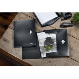 - Die Box verfügt über 3 Klappen, die ein Herausfallen der Unterlagen verhindern. Der recycelbare Verschluss schützt die Dokumente beim Transport