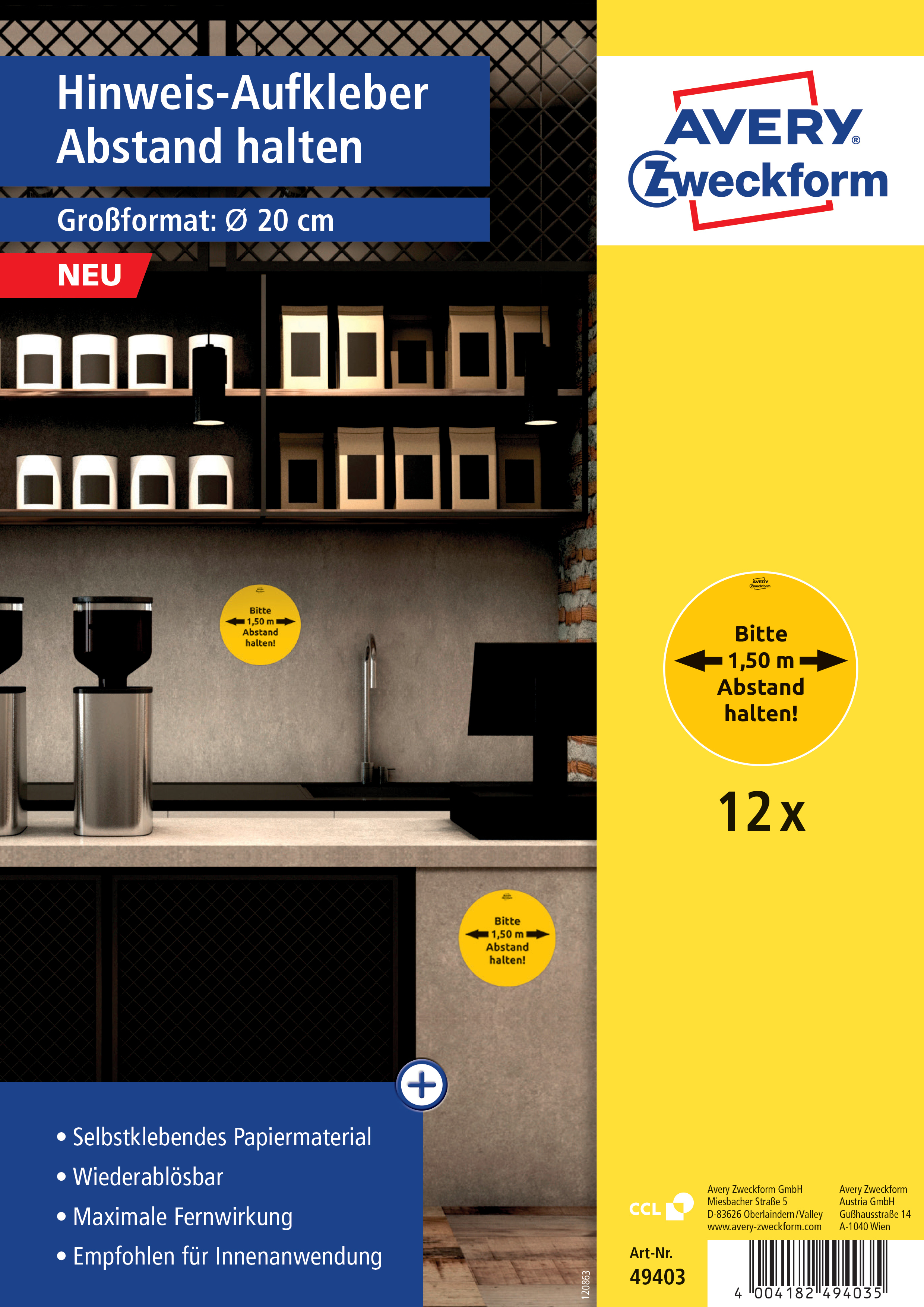 Suchen::449711 AVERY ZWECKFORM Hinweis Aufkleber DE 20cm 49403Z Abstand halten 12 St ck