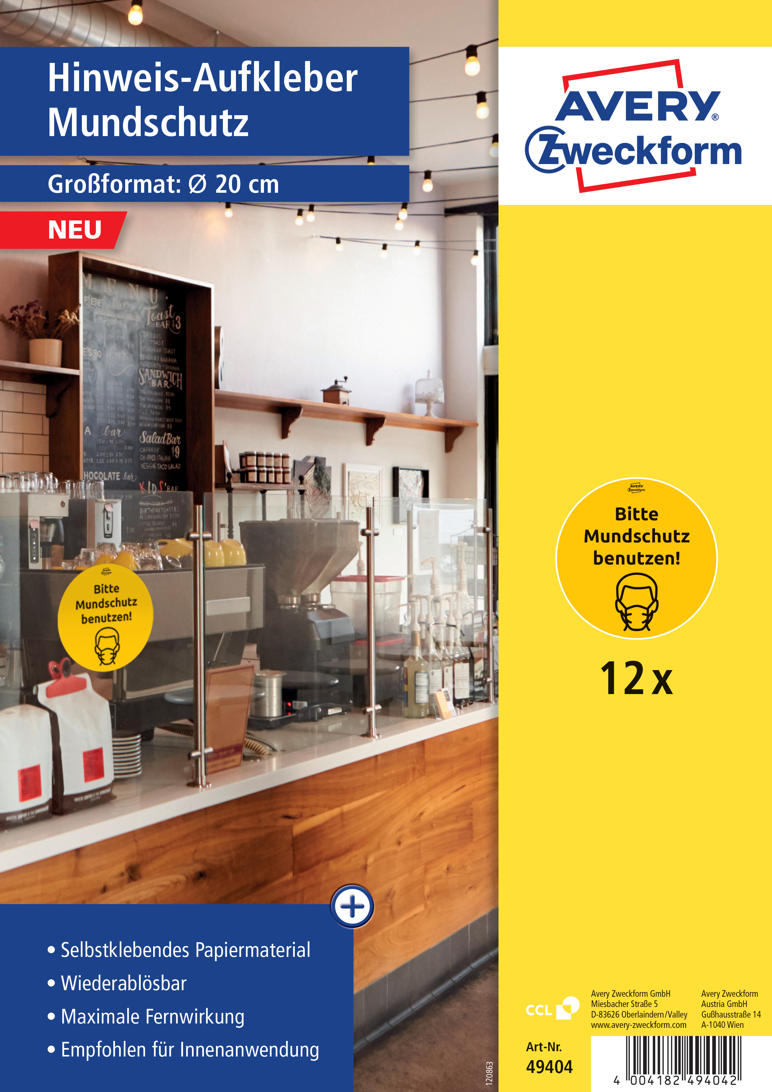 Suchen::449712 AVERY ZWECKFORM Hinweis Aufkleber DE 20cm 49404Z Mundschutz 12 St ck