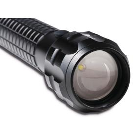 Für die professionelle Anwendung, Länge 28,7 cm. Hohe Leuchtweite und Lichtstärke, lange Leuchtdauer. Outdoor-tauglich: Für den Einsatz im Freien geeignet, spritzwassergeschützt (IPX4). Variabel: Verstellbarer Lichtkegel (Zoom-Funktion) für gestreutes Nahlicht oder konzentriertes Fernlicht. 3 Lichtstufen: Helligkeit hoch (100%), Helligkeit niedrig (30 %), Stroboskoplicht (Lichtblitze) zur Gefahrenabwehr. Ideal im gewerblichen Bereich, für Handwerker, in der Werkstatt, beim Laufen im Dunkeln, beim Camping. Robuste Gehäuse-Konstruktion, Aluminium mattschwarz eloxiert, korrosionsbeständig. Durchdacht: Gehäuse mit rutschhemmender Struktur für sicheren Griff, Ø 3,9 cm. Praktisch: Stand- und Handlampe, kann auf ebenem Untergrund, z. B. als Tischbeleuchtung, aufgestellt werden. Einhändige Bedienung der Lichtstufen: Gummierter Druckknopf vorne seitlich. Schnelle und bequeme Verstellung des Lichtkegels durch Verschieben des Reflektors nach vorne oder hinten.