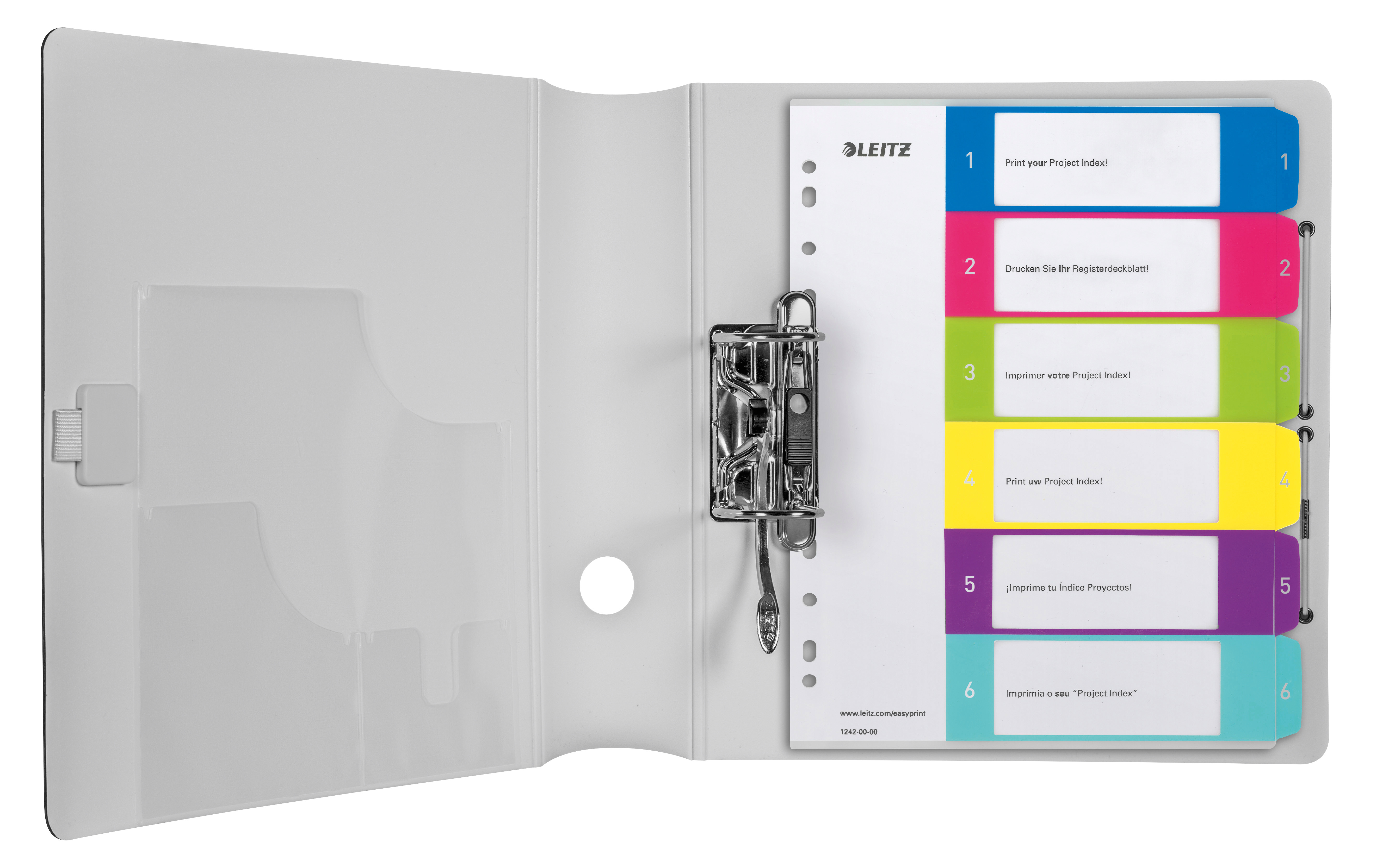 Wiederverwendbares, extra langlebiges Register in schwarz-weisser Kombination. Über www.leitz.com/easyprint wird ein Standard A4-Blatt beschriftet, das hinter das durchsichtige Frontblatt des Registers gelegt wird. Das A4-Deckblatt kann beliebig oft ausgetauscht und das Register so immer wieder verwendet werden.