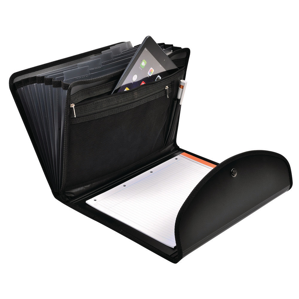 Exactive, die Marke für eine innovative und mobile Ablage. Mit vielseitigen und funktionellen Produkten, an die neuen Formen der Or ganisation und Ablage angepasst. Leicht und einfach zu transportieren, für den intensiven und täglichen Gebrauch. Ordnungsmappe mit 6 Fächern, Schreibblockhalter und Notizblock, mit verstärktem Fach für Laptop, Hüllen mit Reissverschluss und Stift ehalterung. Der Schreibblock-Halter passt sich allen Schreib- und Spiralblöcken an, so dass er sehr gut wieder aufgefüllt werden. Taben mit Etikettenhaltern. Wird mit Etikettenbogen geliefert, die mit Kreaman personalisiert werden können. Exafolio bietet alles in einem, ist ideal, um Notizen zu erstellen und perforierte und nicht perforierte Dokumente zu ordnen und abzulegen.